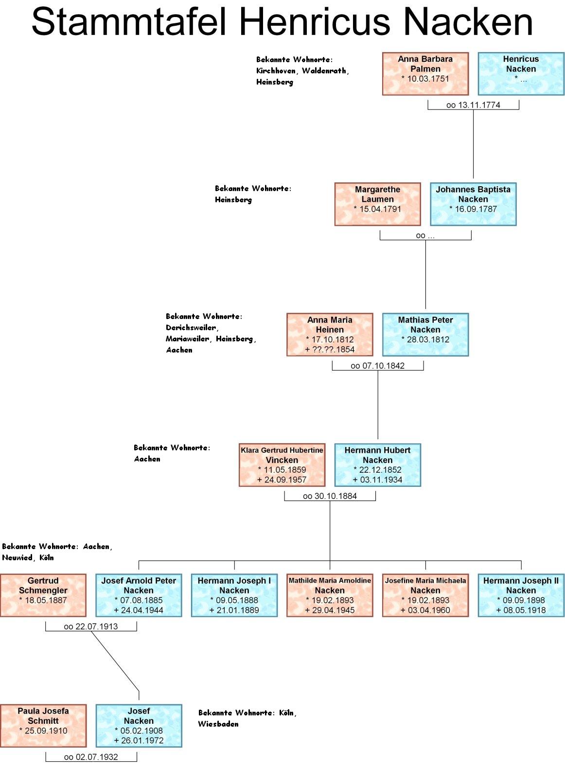 Unter Stammtafel Henricus Nacken findet Ihr eine Gesamtübersicht aller Personen und deren Verwandschaftsgrad aus Sicht meines ältesten bekannten Vorfahren Henricus Nacken bis hin zu meinem Großvater Josef Nacken. Unter Die Nackens findet Ihr zu jeder Person entsprechende Detailinformationen.